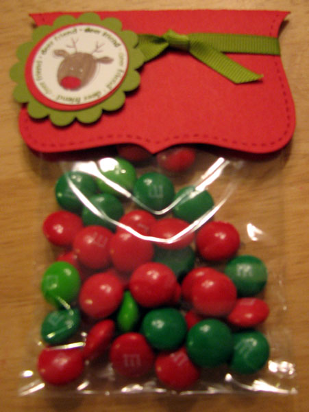 The boys each choose 2 favorites from the Hostess set “Deer Friends” and colored the stamps to get the great colors. We used just one Stampin’ Dimensional on the bottoms so that you could slip the ribbon off the top and get to the treats.