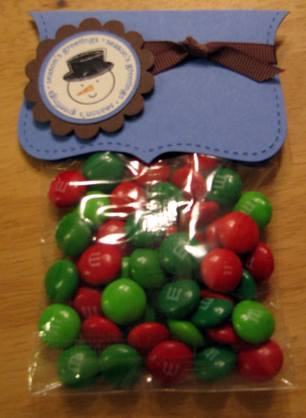 We filled the little bags with treats and stapled them to the back of the topper. Then I tied the ribbon around it. We used the scallop punch, the 1 3/8 Circle Punch and the 1 1/4 Circle Punch to create our little tags.