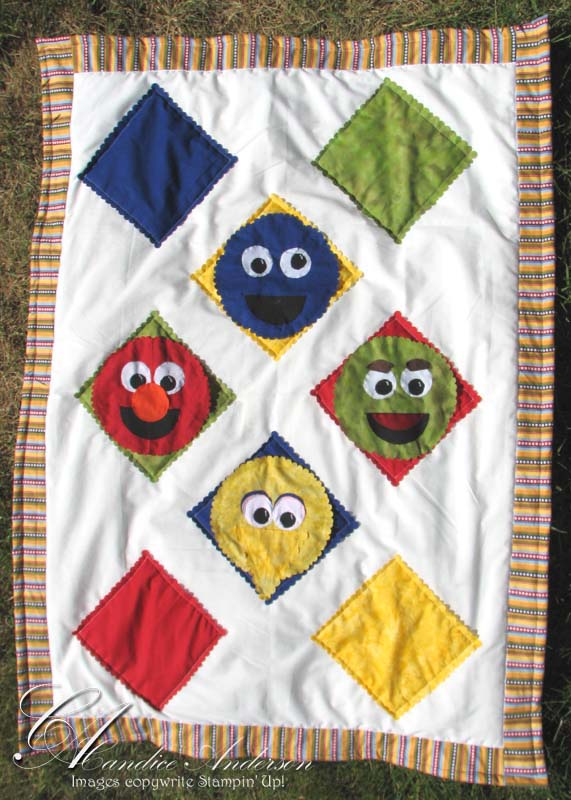 So I just had to share this fun quilt I made for my little boy. He loves Elmo and so I was looking at the cute sweat treat cups that I made using Elmo, Big Bird, Oscar and Cookie Monster. Then I remembered the technique I just learned of how to create larger fabric squares and circles.