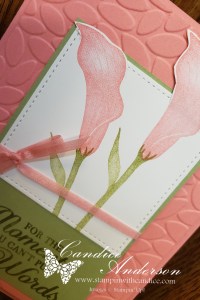 Here’s a close up of the avid stamper card so you can see the details of the petal burst embossed background as well as the stitched framelits around the lilies.