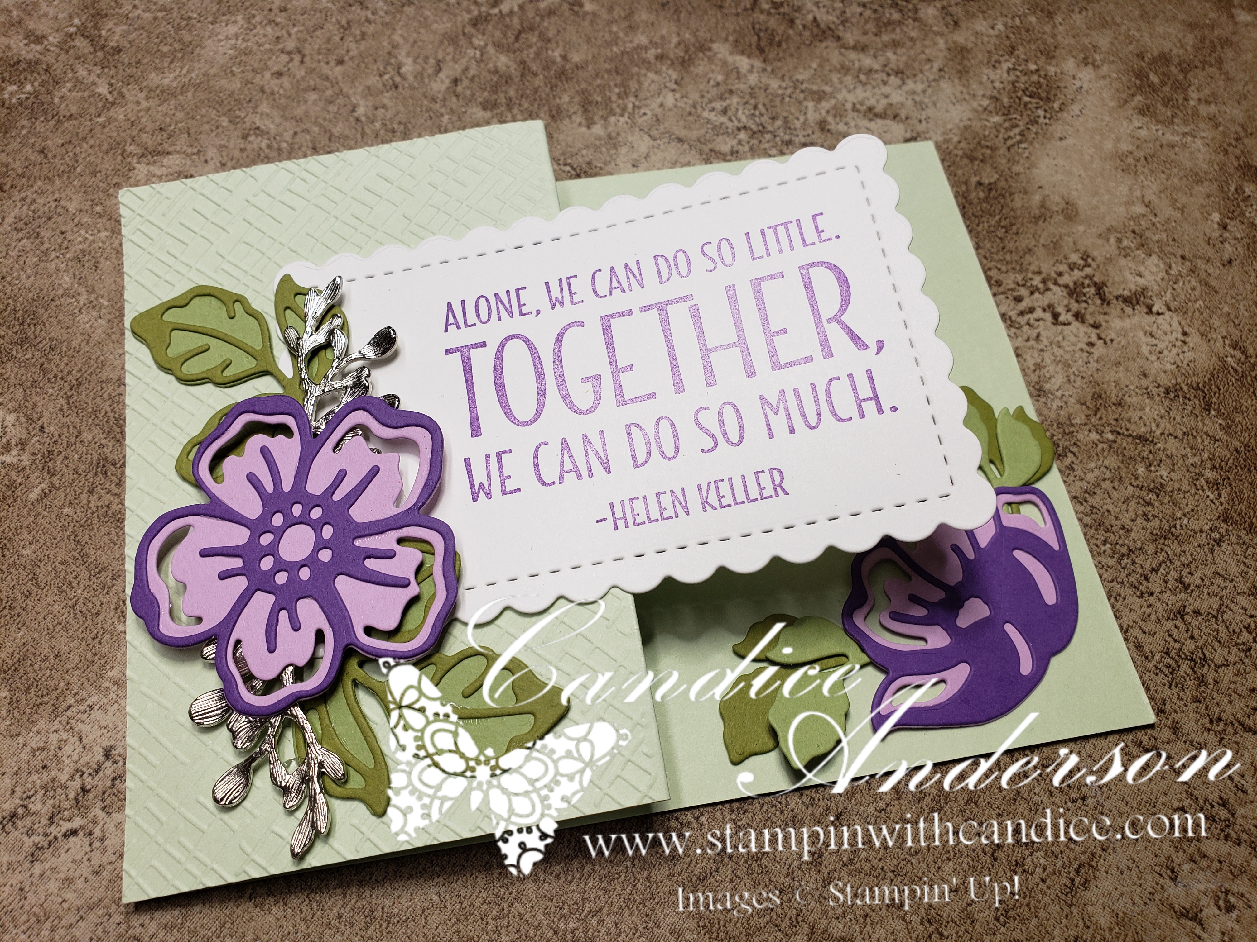 I wanted to try a card that featured using just dies for the main image. As I have the Summer Shadows dies and not the stamp set I thought this would be the perfect die set to give this a try. I decided to go with the purple and green theme again. This is a Z-fold card using a die cut image as the overlap. I love all the saying is the Stepping Stones stamp set and will be sad to see them go.