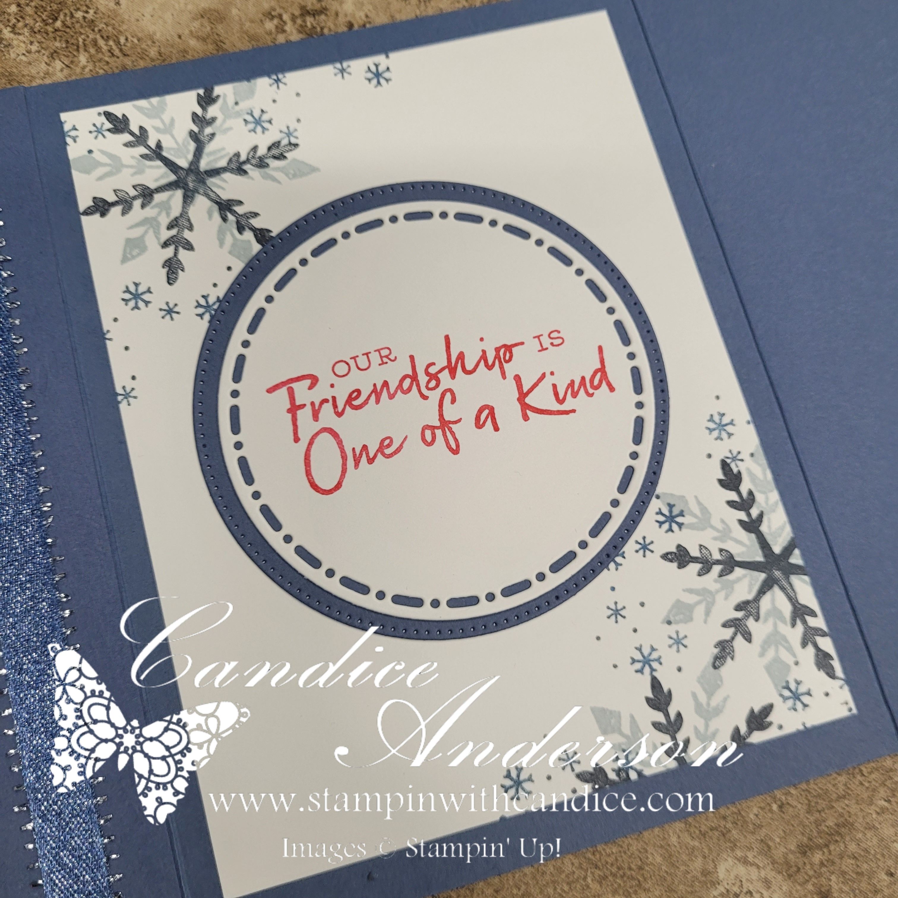 For this design, I focused on cool winter blues, combining a few of this yearโs beautiful In Colors โ Cloud Cover and Secret Sea โ with Misty Moonlight for depth. I added a pop of brightness with Poppy Parade, then finished it off with sparkle using Wink of Stella and the Misty Moonlight Silver-Edged Ribbon.