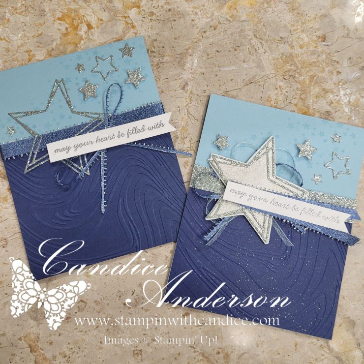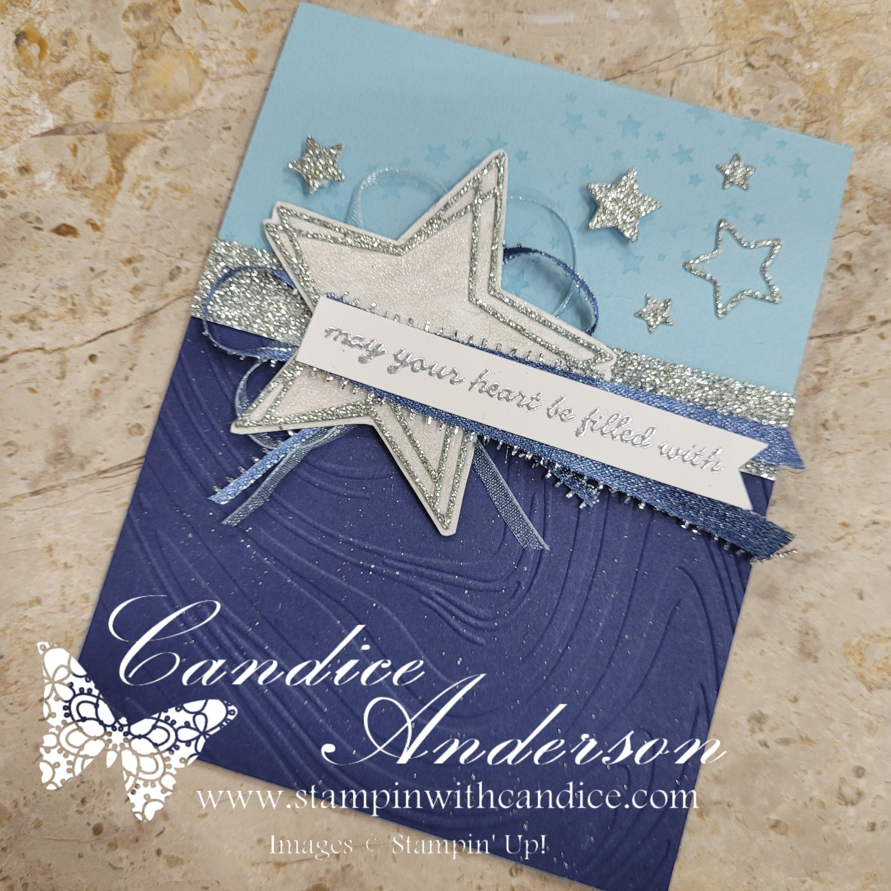 I used the same ribbon-cutting technique but added Balmy Blue Sheer Ribbon (#165767) behind the star as well. I even repurposed the extra little silver strips I trimmed awayโperfect for accenting the sentiment!