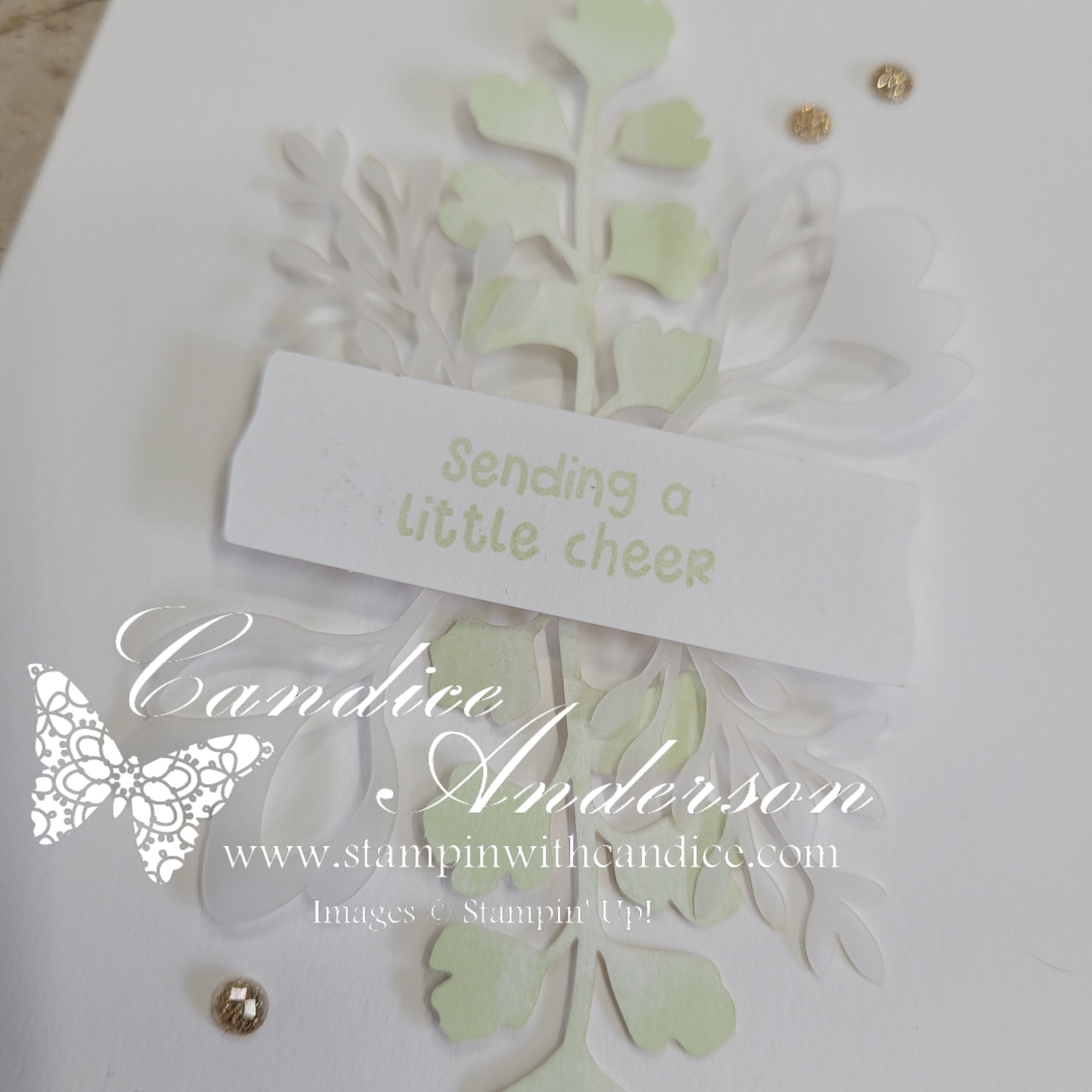 I love the soft color palette in this kit, so next I grabbed the A Little Cheer Stamp Set (#166121) and the coordinating dies (#166123) and began the holiday transformation. My personal challenge was to use only the paper that came in the kit, so I: