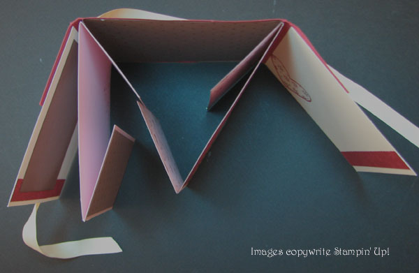 This book was created by Evelyn Wood.  She used the Love you Much & Polka Dot Stamp Sets.  Colors are Riding Hood Red, Very Vanilla, Close to Cocoa and Pink Pirouette.  She also used the Candy Lane DSP, Vanilla 5/8 Ribbon adn Scallop edge punch.  You can check out more of her creations at www.thestampingsiren.com.love-flip-book-openlove-flip-book-top