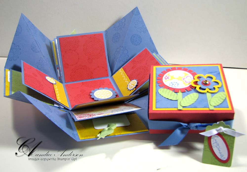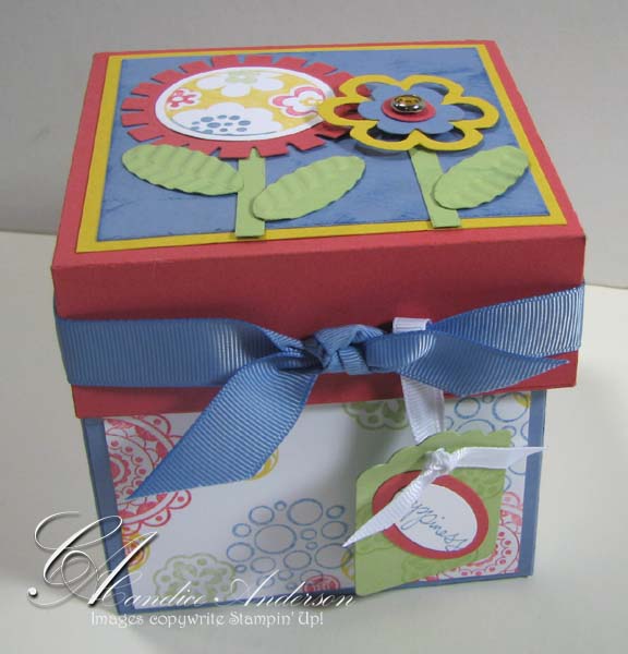 So I saw this idea on my friend Patty’s blog and just had to try it. It’s made with our thick window sheets. I simply cut out the box using our fancy favor’s box die and my Big Shot. Then I I embossed it with the Petals-A-Plenty Impressions Folder from the Holiday Mini.